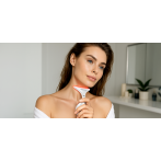 Прибор с микротоковой технологией предназначен для коррекции возрастных изменений шеи: кольцевидных горизонтальных морщин, провисаний кожи и ослабленного мышечного каркаса. Микротоковая технология EMS MicroCurrent искусственно повышает тонус платизмы — широкой веерообразной мышцы, которая формирует чёткий шейно-подбородочный угол и стройную линию шеи. В результате укрепления мышечного каркаса уходят возрастные деформации: менее видимыми становятся внешняя дряблость, глубокие залегания морщин и «кольца Венеры». Под воздействием термолифтинга и микровибраций подтягивается контур нижней трети лица, снижается задержка жидкости и в оптимальном состоянии сохраняется тонус мягких тканей. Фототерапия активизирует омолаживающие, ресурсосберегающие и защитные функции кожи. За счёт плавного изгиба рабочей поверхности прибор легко скользит по поверхности кожи и захватывает все треугольники и границы шеи. При необходимости можно сместить фокус и, двигаясь в направлении основных массажных линий, использовать прибор в области лба, подбородка и скул.